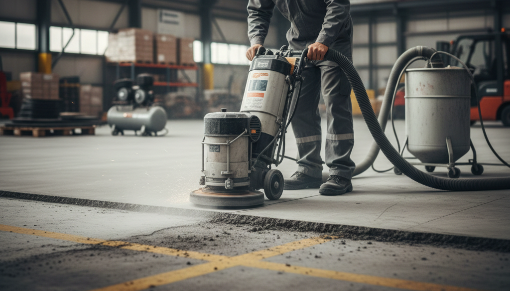 - Alat & Material: Mesin Floor Grinder untuk memangkas area tinggi.